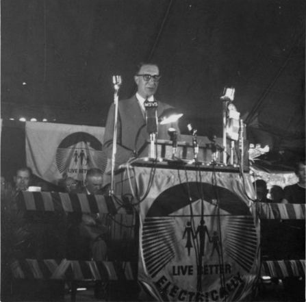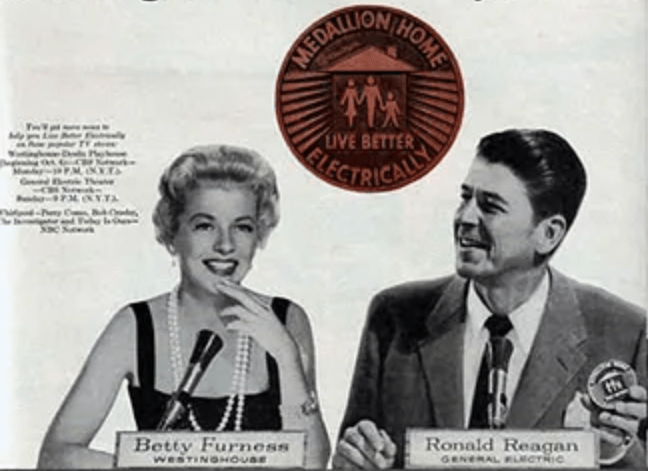 Yes, that’s future President Ronald Reagan there on the right. Reagan was the chief spokesman for GE at the time, and was one of the primary faces of the LBE campaign. In one episode of “General Electric Theater,” he took viewers on a tour of his all-electric home in Pacific Palisades.