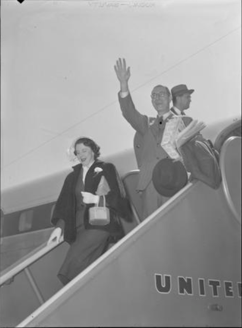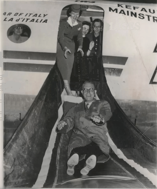 Once they’d safely touched down, however, the traveling party faced a different challenge. Typically, upon landing, the ground crew would roll a stair ramp up to the plane exit door, and Kefauver would come out like this: