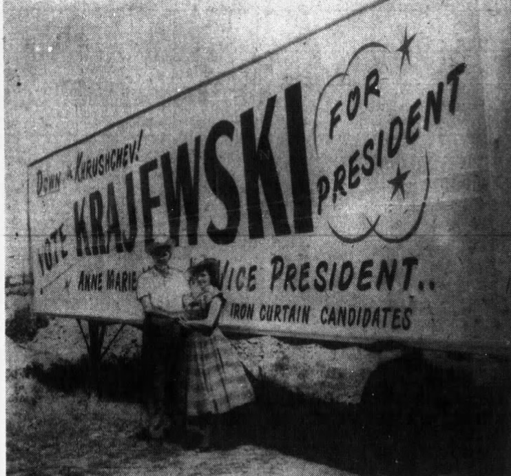 Doubtless noticing the upward trend in his vote totals, Krajewski perhaps felt his time had come in 1956. In a surprisingly progressive move, he selected a female running mate: Anna Marie Yezo, a housewife from North Bergen. At her suggestion, he added a new campaign plank for the ladies: a “compulsory two-month training for girls in outdoor life and helping the farmer’s wife.” He also had a new foreign-policy idea: annexation of Canada “to get back the money we loaned to England.”