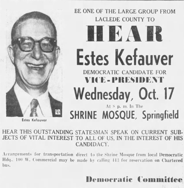That evening, Kefauver spoke at the Shrine Mosque before a standing-room-only crowd of over 4,000 people. Not only did he reportedly outdraw Stevenson, who was speaking in Flint, Michigan on the same night, he drew the same size crowd that Vice President Richard Nixon did on his visit to Springfield three weeks before. Given Springfield’s Republican bent, it was an impressive crowd. Local observers said it was the largest gathering the city had ever seen for a Democratic candidate.