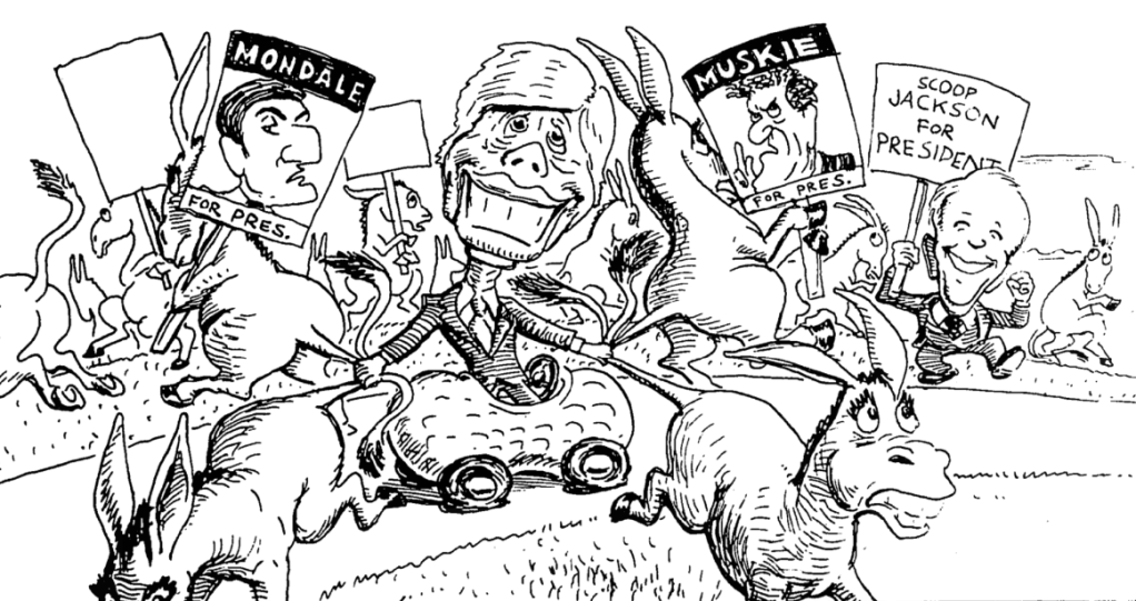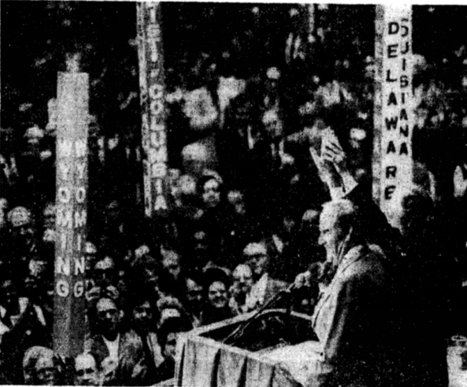 The convention heard from several aspiring 1976 Presidential candidates including Sanford, Georgia Gov. Jimmy Carter, Texas Sen. Lloyd Bentsen, Washington Sen. Scoop Jackson, Arizona Rep. Mo Udall, and the infamous George Wallace (who rolled through the hall in his wheelchair shouting, “Make way for the front-runner!”).