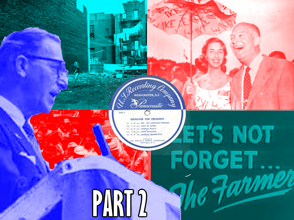 A couple weeks ago, we listened to the first five of a set of ten Kefauver for President ads recorded and released in 1956 by the DC ad agency Kal, Ehrlich, and Merrick. In those ads, Kefauver described his views on small business, the plight of farmers, foreign policy, the Eisenhower administration’s love of big business, and flood control. (If you missed that post, click here.)