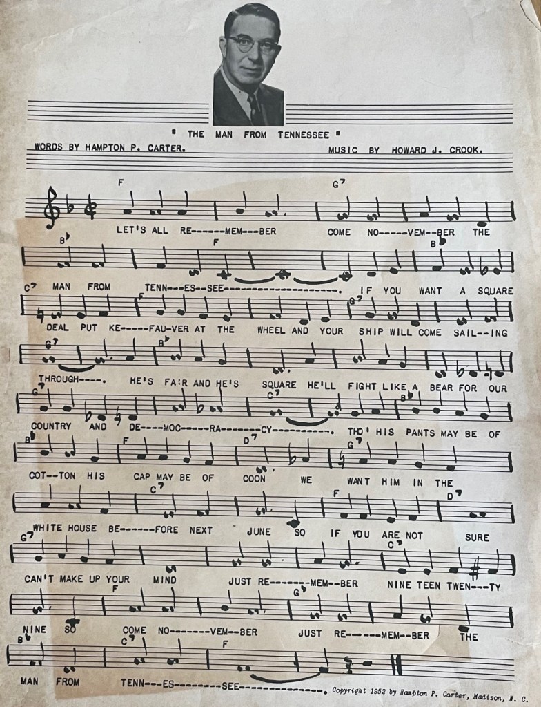 That June, Carter picked up his songwriter’s pen and wrote “The Man From Tennessee,” an ode to Kefauver. He worked with a Greensboro musician named Howard Crook, who supplied the music to go with Carter’s lyrics.